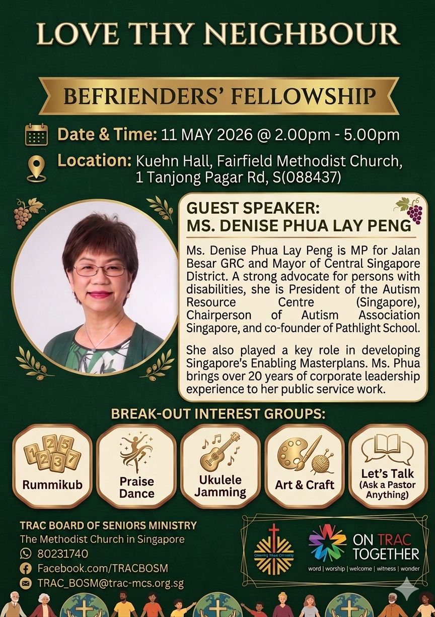 Date : Mon 11 May 2026 Time : 2.00 pm – 5.00 pm Speaker : Ms. Denise Phua Lay Peng Location : Fairfield Methodist Church (Kuehn Hall)